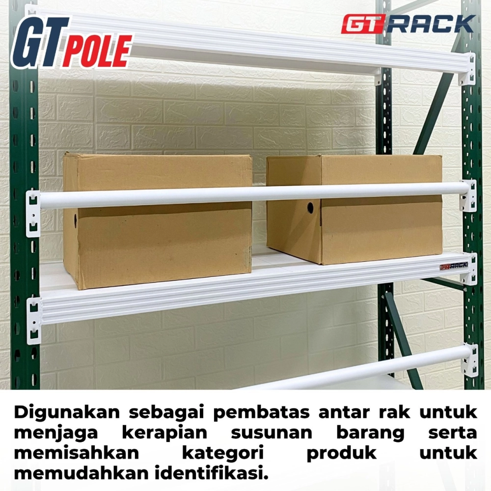 Selain digunakan sebagai sistem gantungan, GT POLE15 multifungsi untuk pembatas barang diatas layer. Pemasangan mudah, seperti pemasangan beam regular pada rak GT Rack lainnya. Gantung dan tempatkan segala jenis barang Kamu mulai dari yang ringan atau berat.